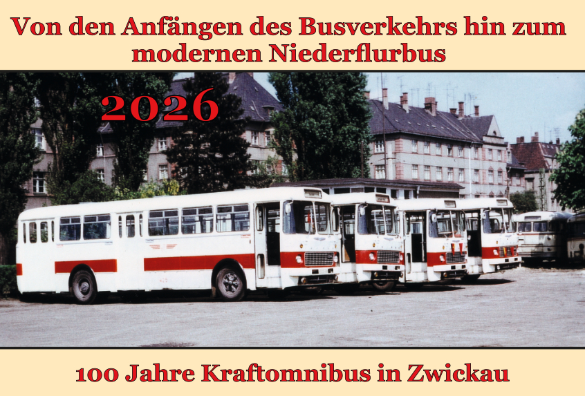 Unser Kalender für das Jahr 2026 widmet sich dem Thema "100 Jahre städtischer Busverkehr in Zwickau". Der Kalender ist ab sofort im Servicecenter der Städtische Verkehrsbetriebe Zwickau GmbH für 12 € erhältlich.
